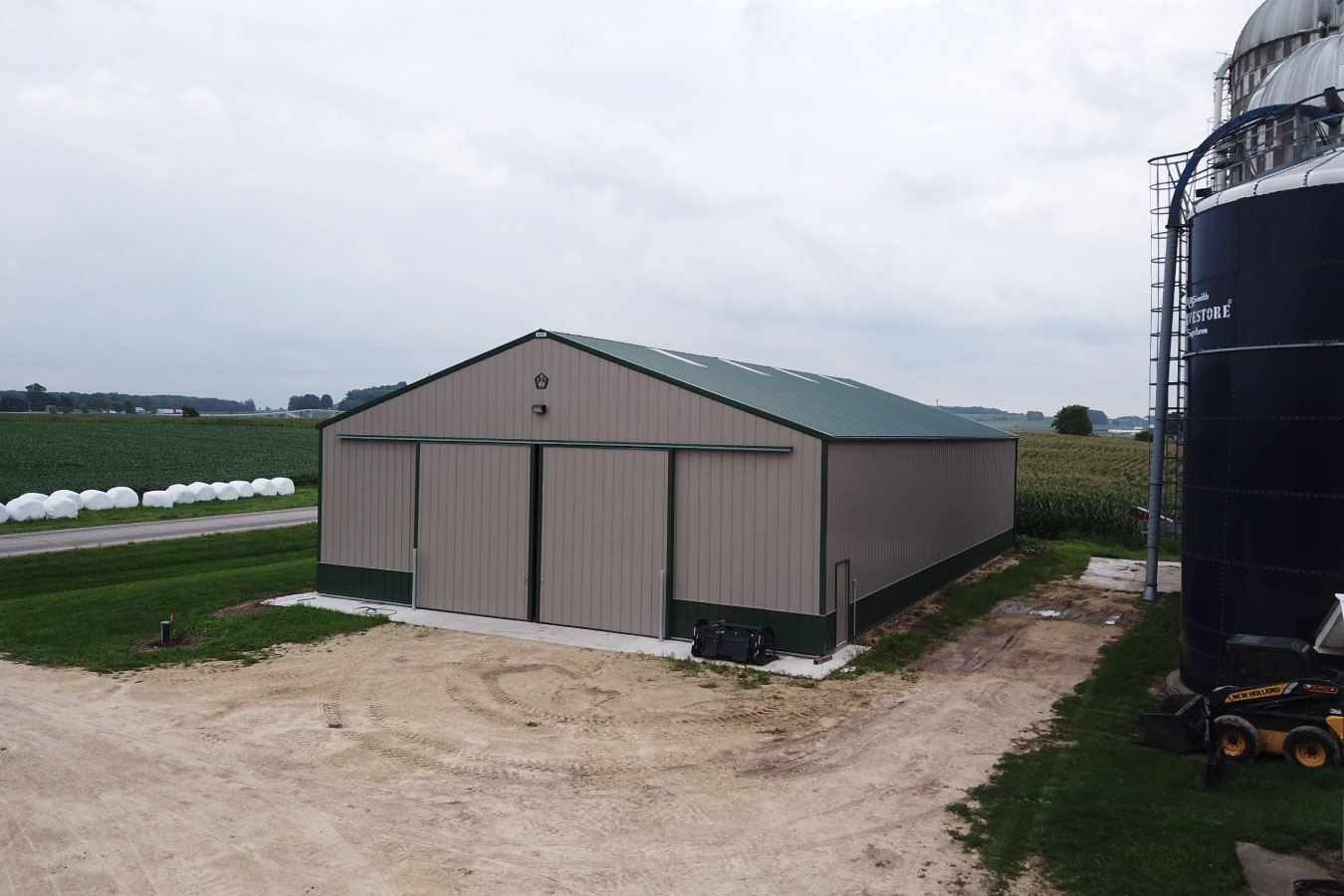The building’s beige 28-gauge G-90 steel siding paired with a forest green roof and trim complements the surrounding farmland, a timeless color palette that blends seamlessly into its environment. And with Walters’ post-frame efficiency, the entire project was completed in just eight working days by a crew of four builders, proof that quality and speed can go hand in hand.