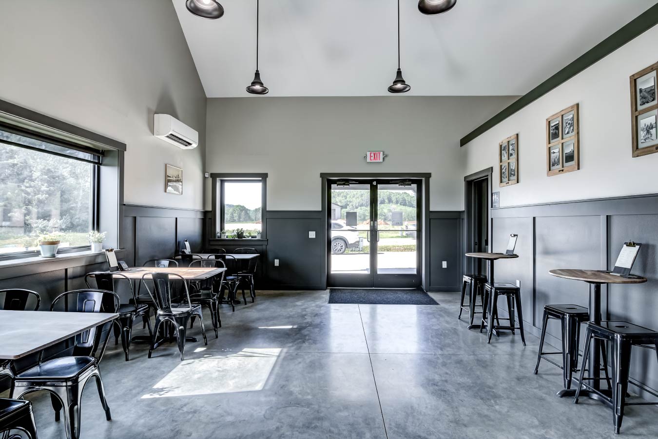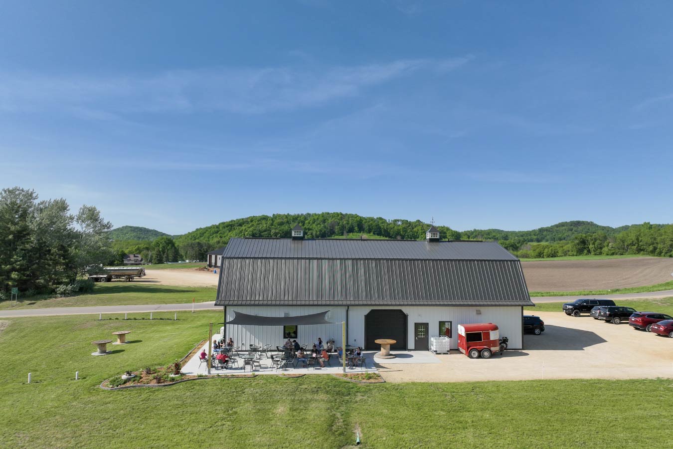 Walters Buildings partnered with the Hetricks to design and construct a 42′ x 74′ gambrel-style post-frame barn that beautifully blends agricultural heritage and modern hospitality. The black-and-white exterior pays homage to the farmstead’s past while the interior offers a warm, inviting space for guests to gather and enjoy handcrafted spirits made right on-site.