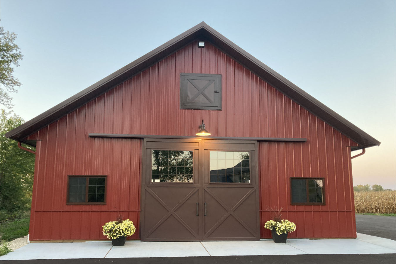 This custom post frame building stands out for its meticulous attention to detail and personalized touches. It includes four practical overhead doors on the side wall and an additional overhead door on the back-end wall, enhancing accessibility. The front façade is adorned with our elegant Touch of Class sliding doors, two strategically placed windows, a decorative hay loft door, and thoughtfully placed exterior lighting above the main entrance.