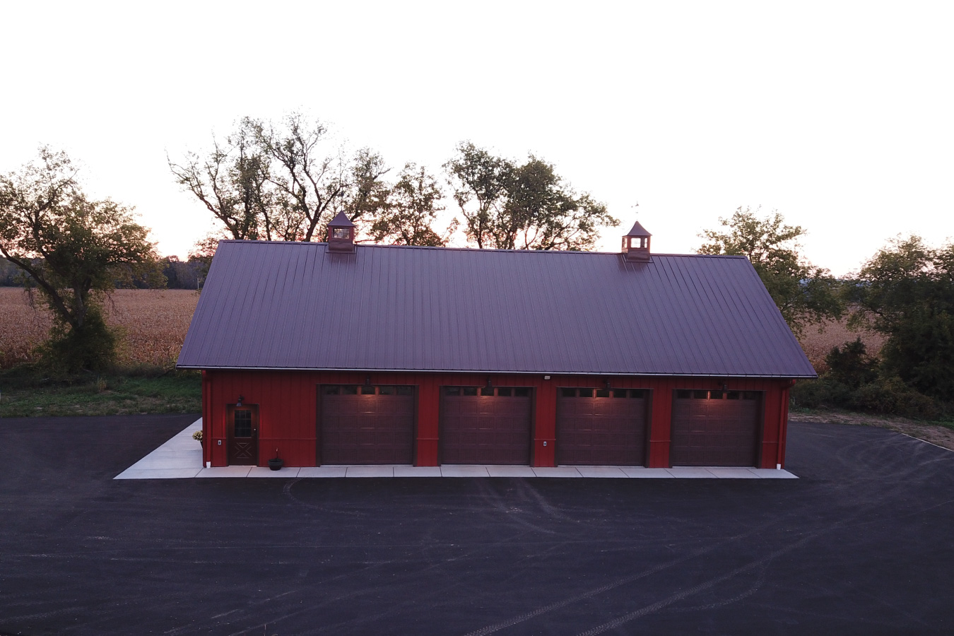 Additional exterior lights illuminate every overhead door and walk door, complemented by twin cupolas atop the roof with integrated LED lighting, creating a striking nighttime presentation.