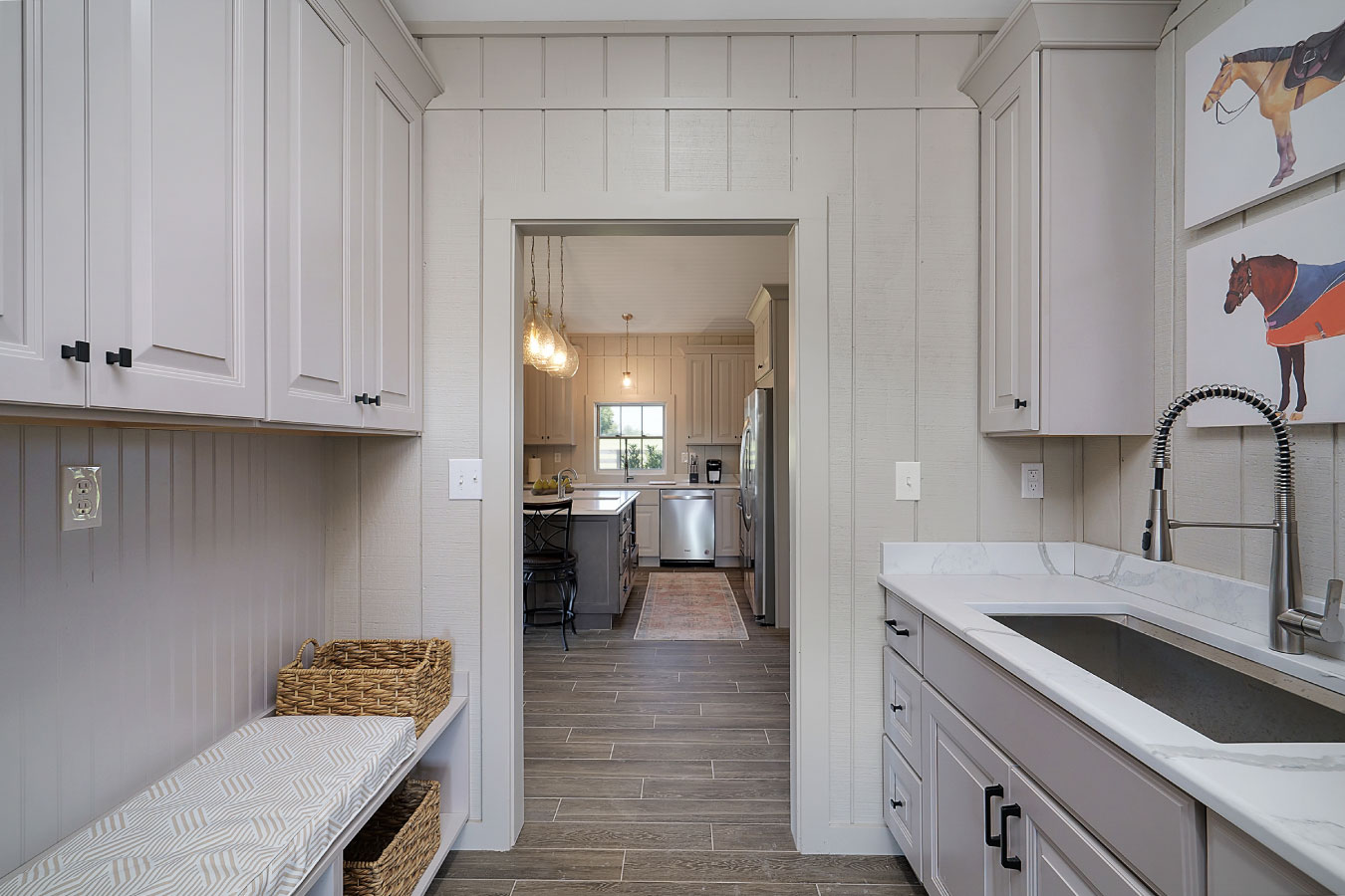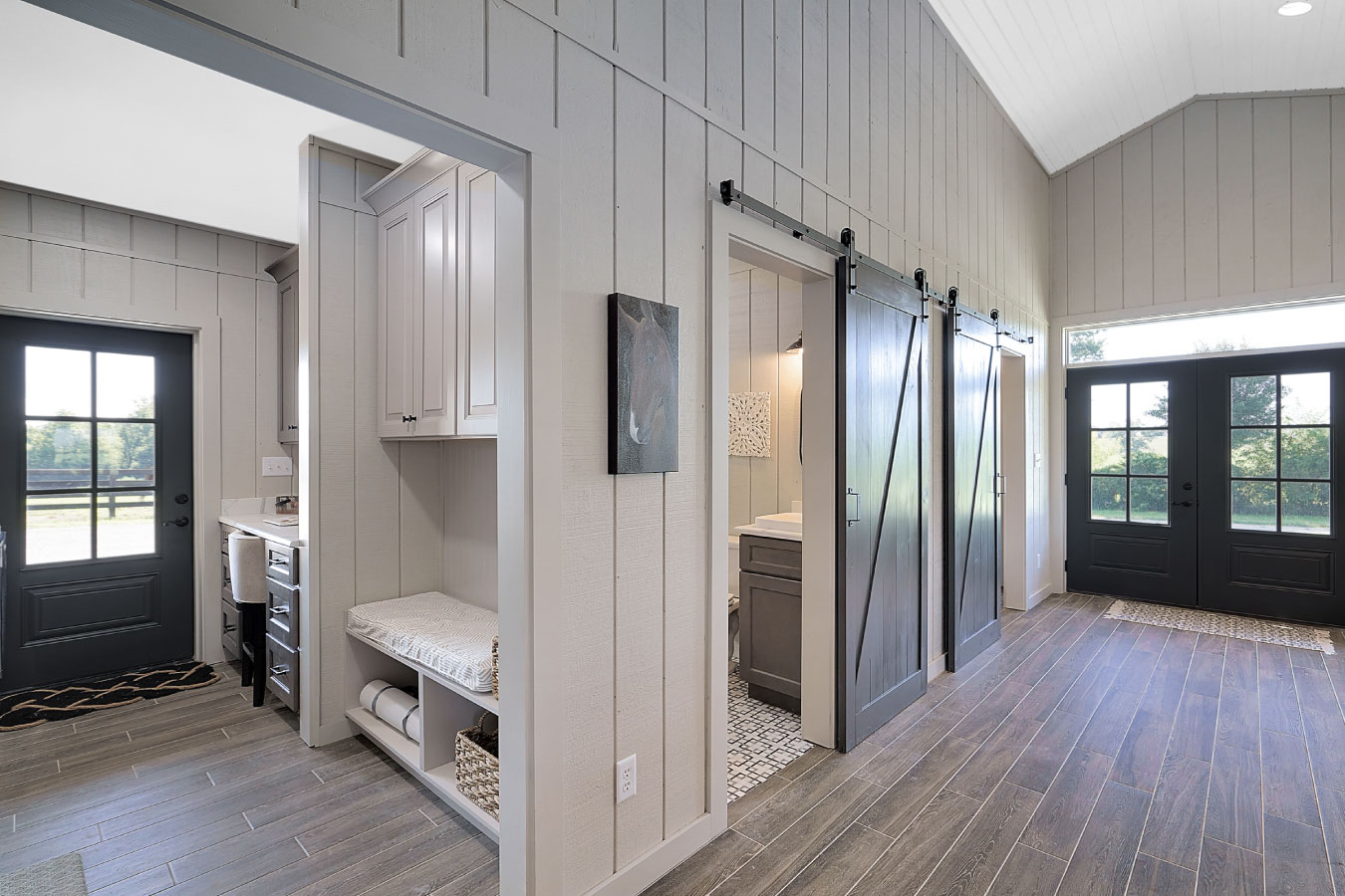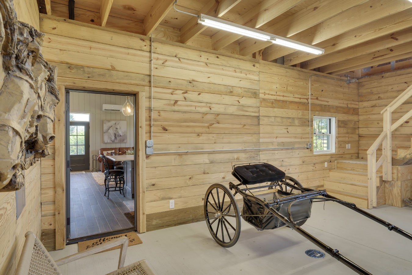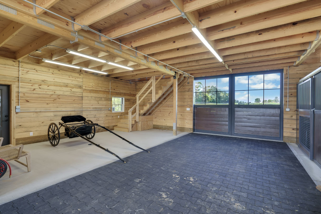 Built by Walters’ experienced crews in partnership with the homeowner, the barn includes four horse stalls, a wash bay, equipment storage, a tack room, and a hay loft, ensuring every aspect of horse care is thoughtfully supported. A lean-to porch provides additional space for storage and easy access to the surrounding pastures.