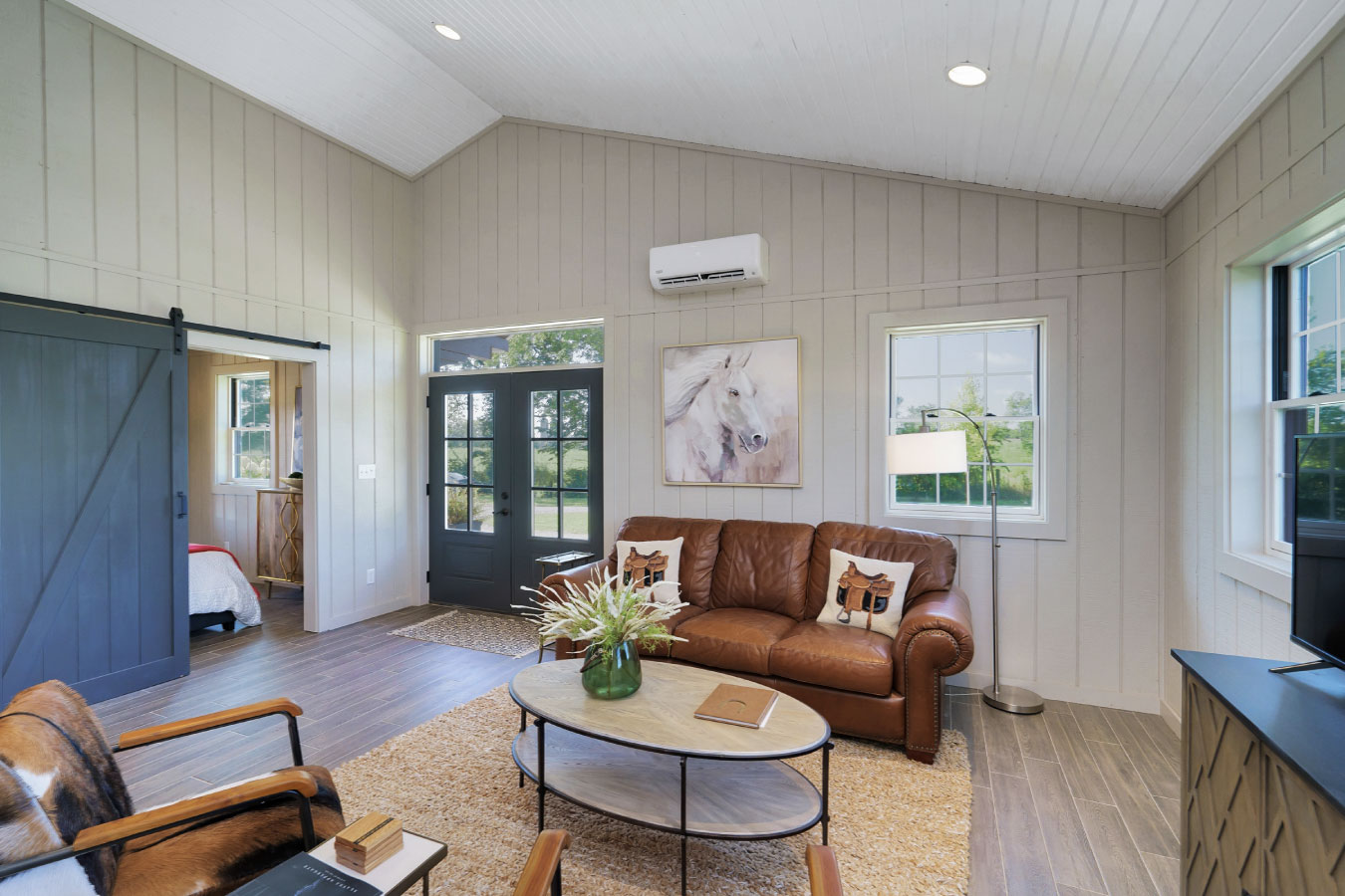 Attached to the barn, the living quarters offer the perfect blend of practicality and comfort. With a full kitchen, cozy living room, bedroom, and bathroom complete with a walk-in shower, the space supports both short stays and long-term use. A utility room with washer, dryer, and workspace enhances day-to-day functionality, while a back porch overlooking the pastures provides a serene retreat after a long day of care or riding.