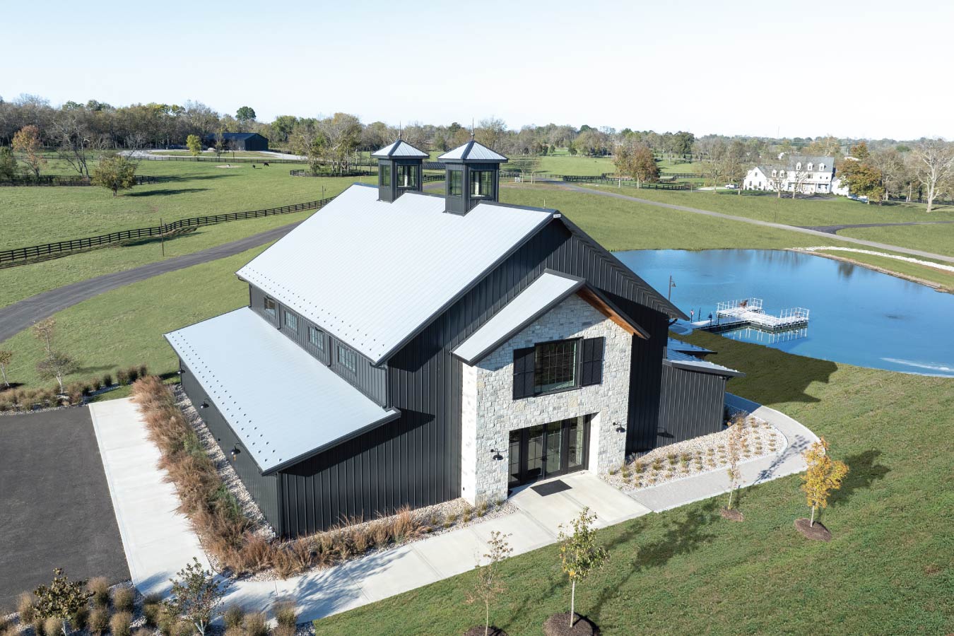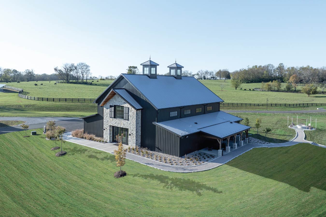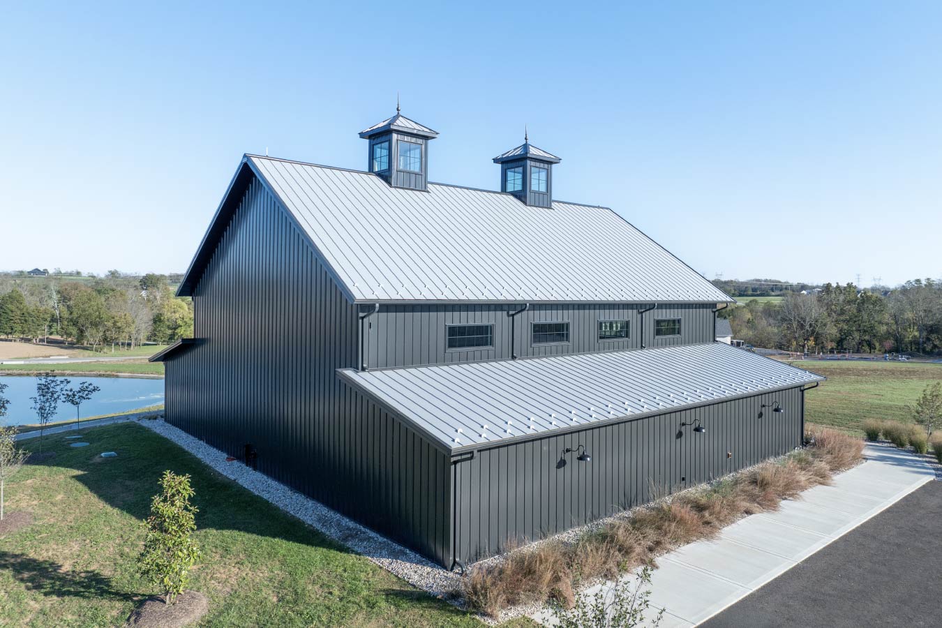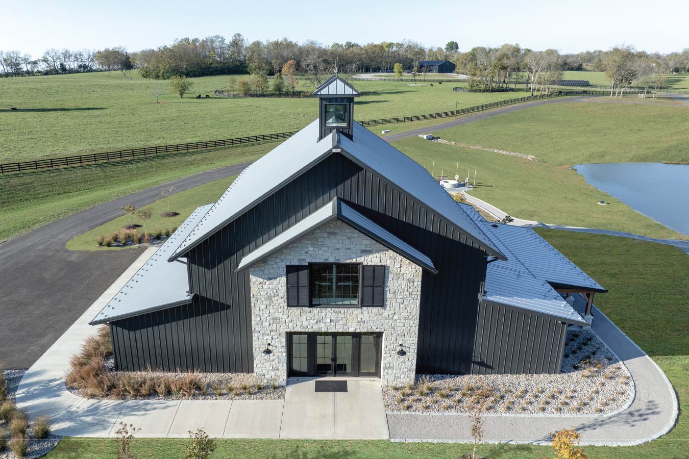 Set against the rolling hills of the Kentucky countryside, the Keene Event Barn was envisioned as a multi-purpose gathering space for celebrations, recreation, and community events. Measuring 60′ × 72′, the structure reflects Walters Buildings’ engineering precision and custom craftsmanship at scale, pairing black steel siding with natural stone wainscot and dual cupolas that crown the roofline.
