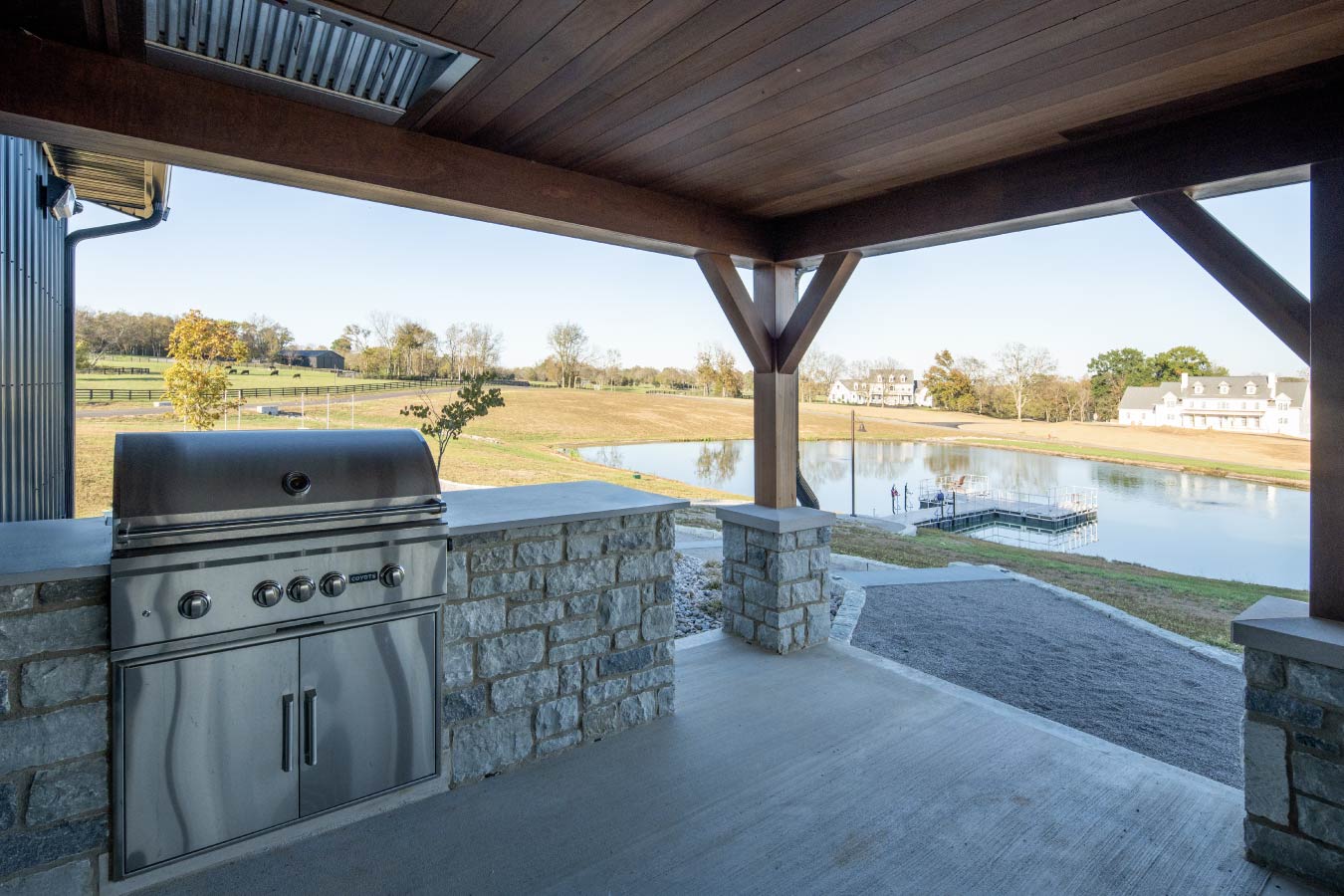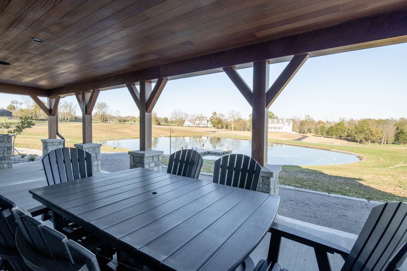 The building’s flying gable entrance and covered porch with grilling area overlook a scenic, man-made pond — an intentional design choice that frames the view and reinforces the barn’s connection to the land. It’s a perfect blend of elegance and approachability: one that feels equally at home hosting a wedding reception, a family reunion, or an evening gathering under the stars.