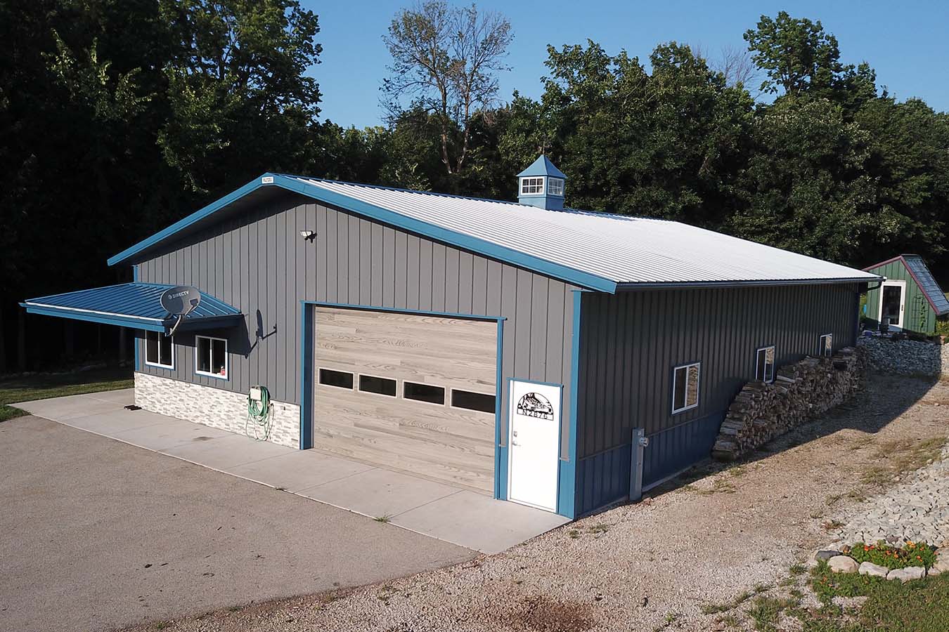 Built in 2018, the Lake House Garage reflects the versatility, durability, and craftsmanship of Walters Buildings’ post-frame design. The charcoal steel siding, accented with blue trim and a galvalume roof, creates a bold coastal-inspired look that ties naturally to the lakefront surroundings.