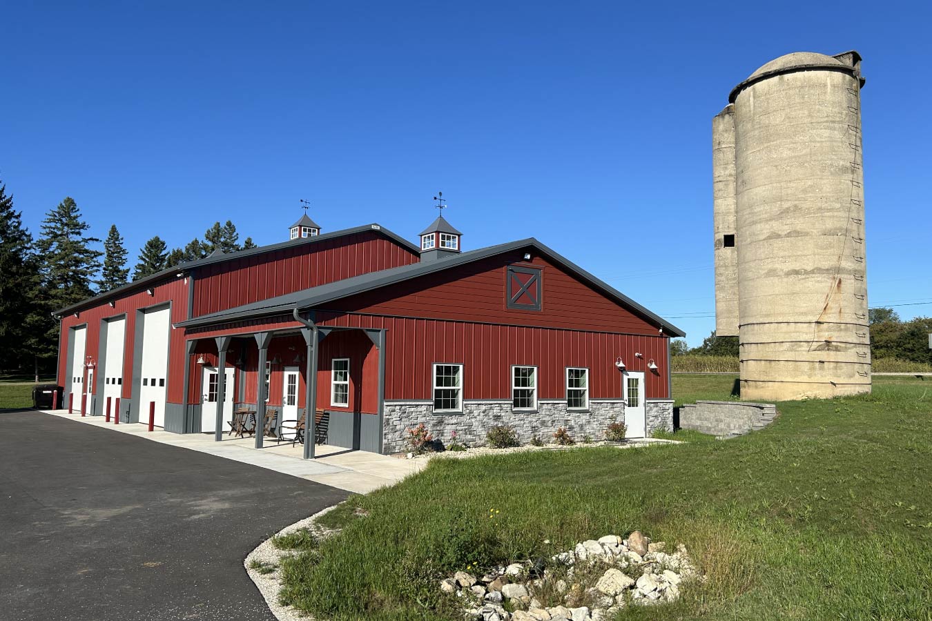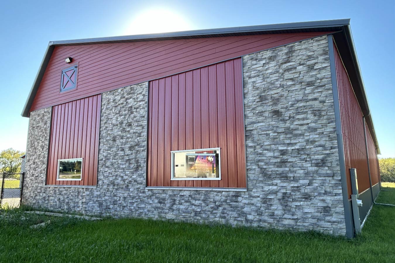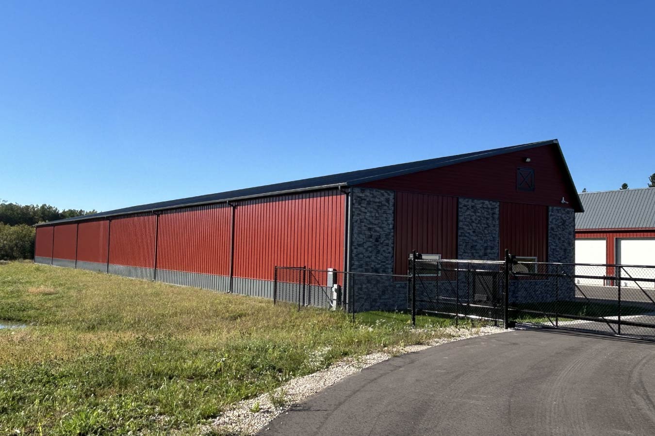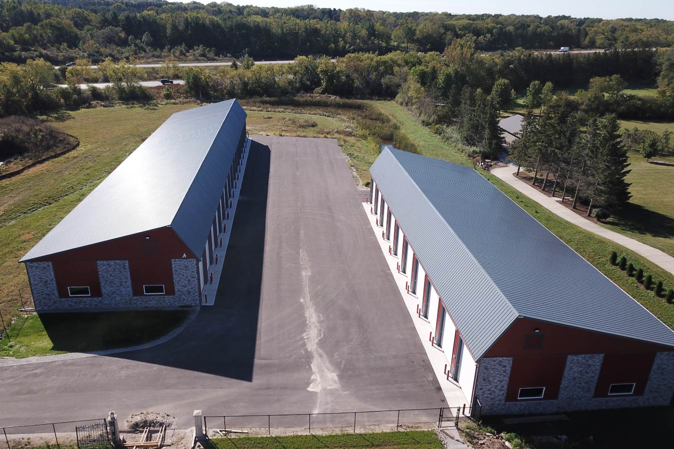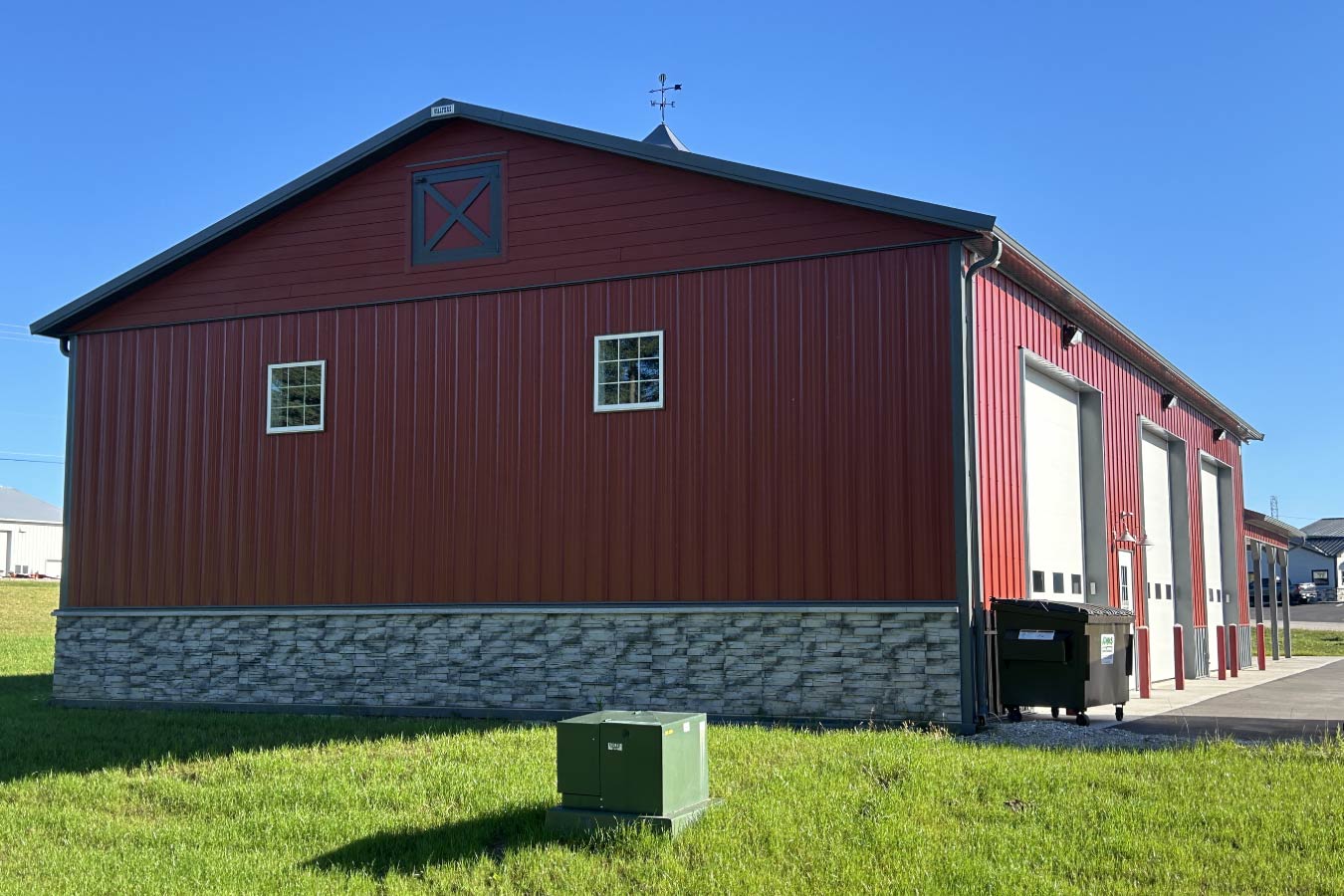 - Building One (42′ x 100′ x 16′) – Includes an office, inset porch, stone masonry wainscot, three cupolas, and three overhead doors for easy access.