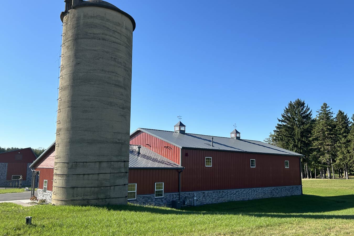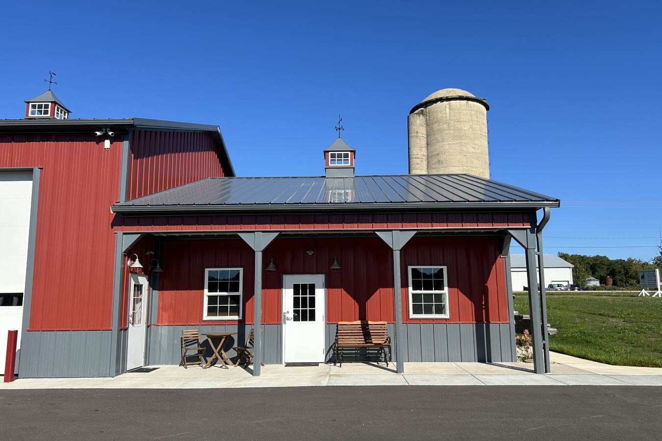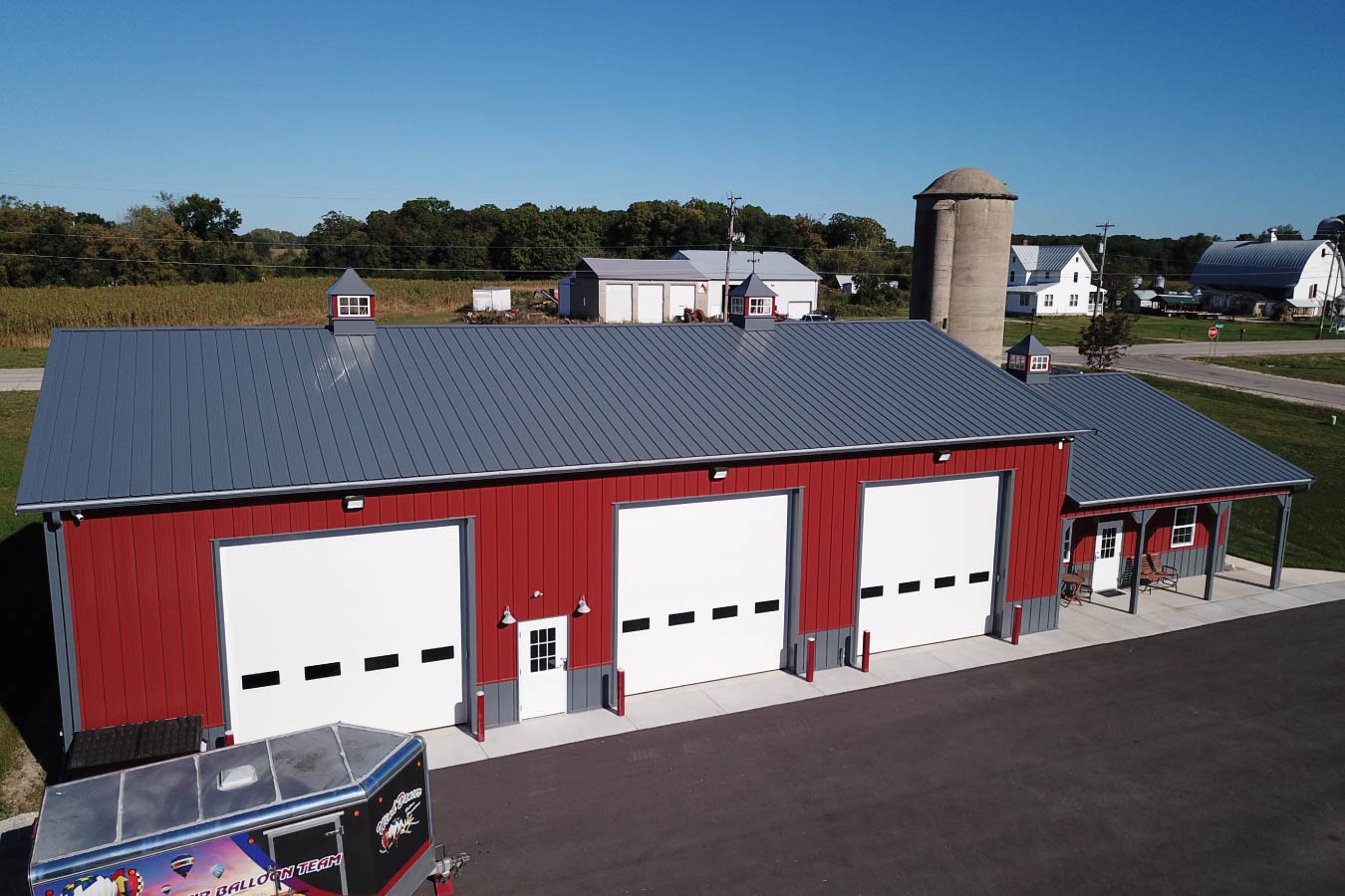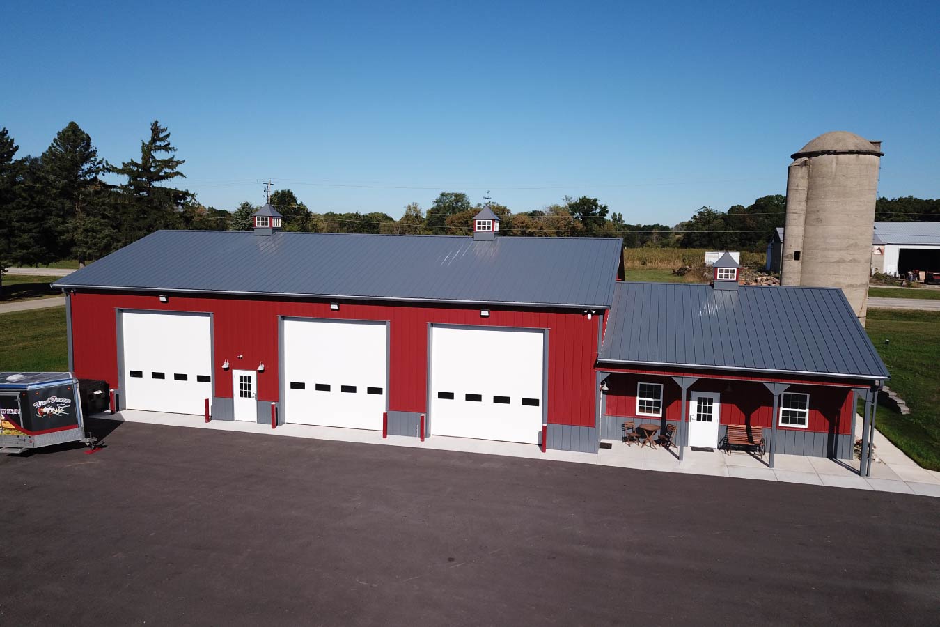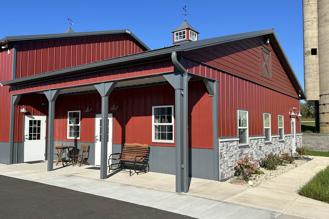 - Building One (42′ x 100′ x 16′) – Includes an office, inset porch, stone masonry wainscot, three cupolas, and three overhead doors for easy access.