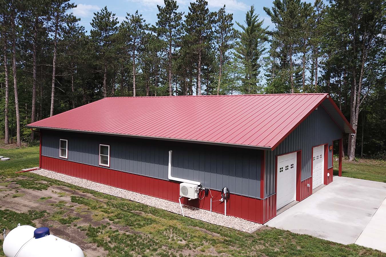 Tucked among the pine forests of northwestern Wisconsin, this pole barn with living quarters offers the perfect balance between comfort and craftsmanship. Designed as both a functional shop and a cozy weekend getaway, it captures the essence of Northwoods living, where mornings start with coffee on the porch and evenings wind down beside a woodstove after a day spent outdoors.