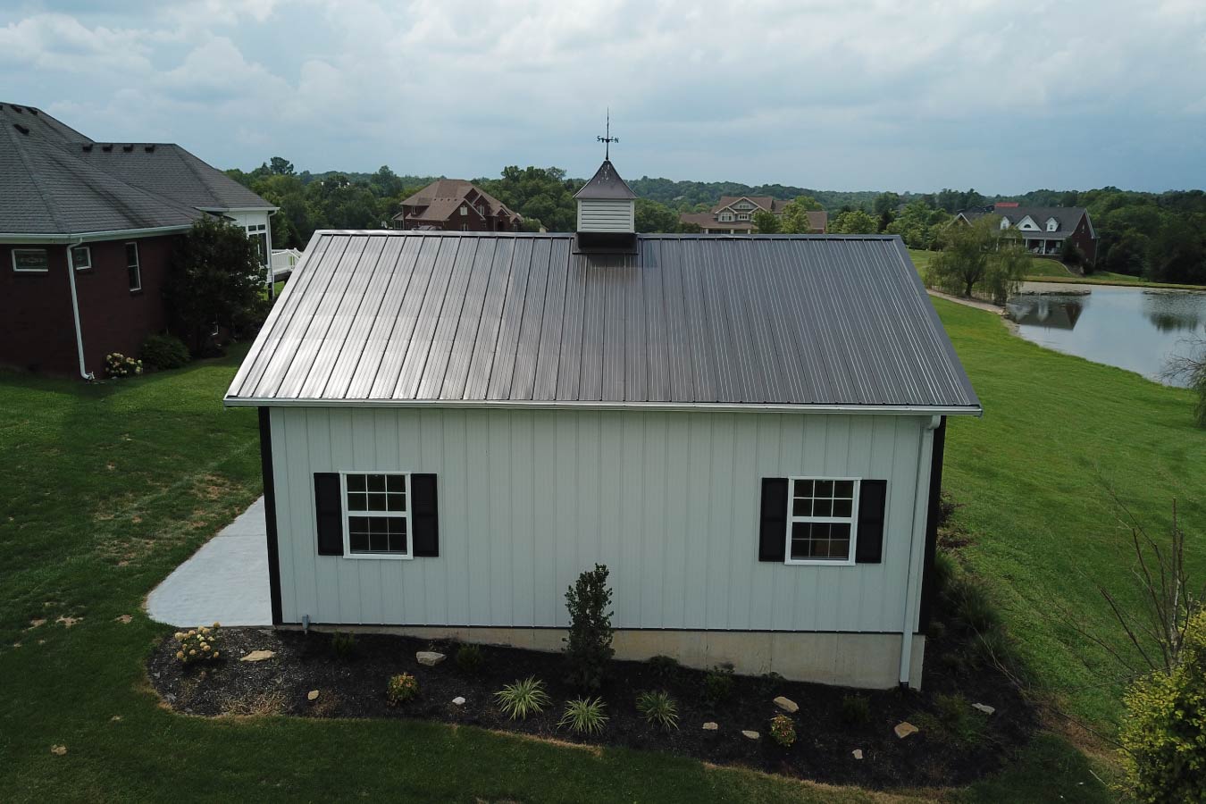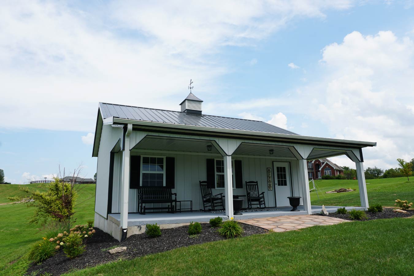 Walters Buildings designed this post-frame shed to deliver style and substance in a modest footprint. A lean-to porch adds character and covered space, while a decorative cupola provides visual balance and timeless appeal. The white steel siding with black trim creates a crisp, classic contrast, and the gable windows bring in natural light while giving the exterior a touch of refinement.
