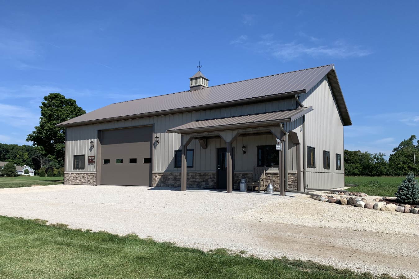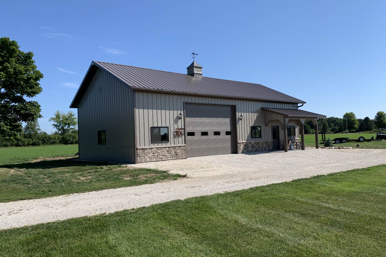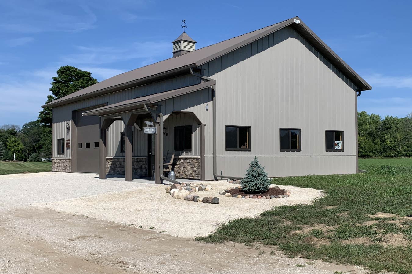Designed for flexibility, this post-frame workshop provides the perfect balance of workspace and visual appeal. A covered porch welcomes guests into the main entry, adding architectural interest and protection from the elements. The front façade is enhanced with mountain stack stone wainscoting, bringing texture and sophistication that elevate the building’s overall look.
