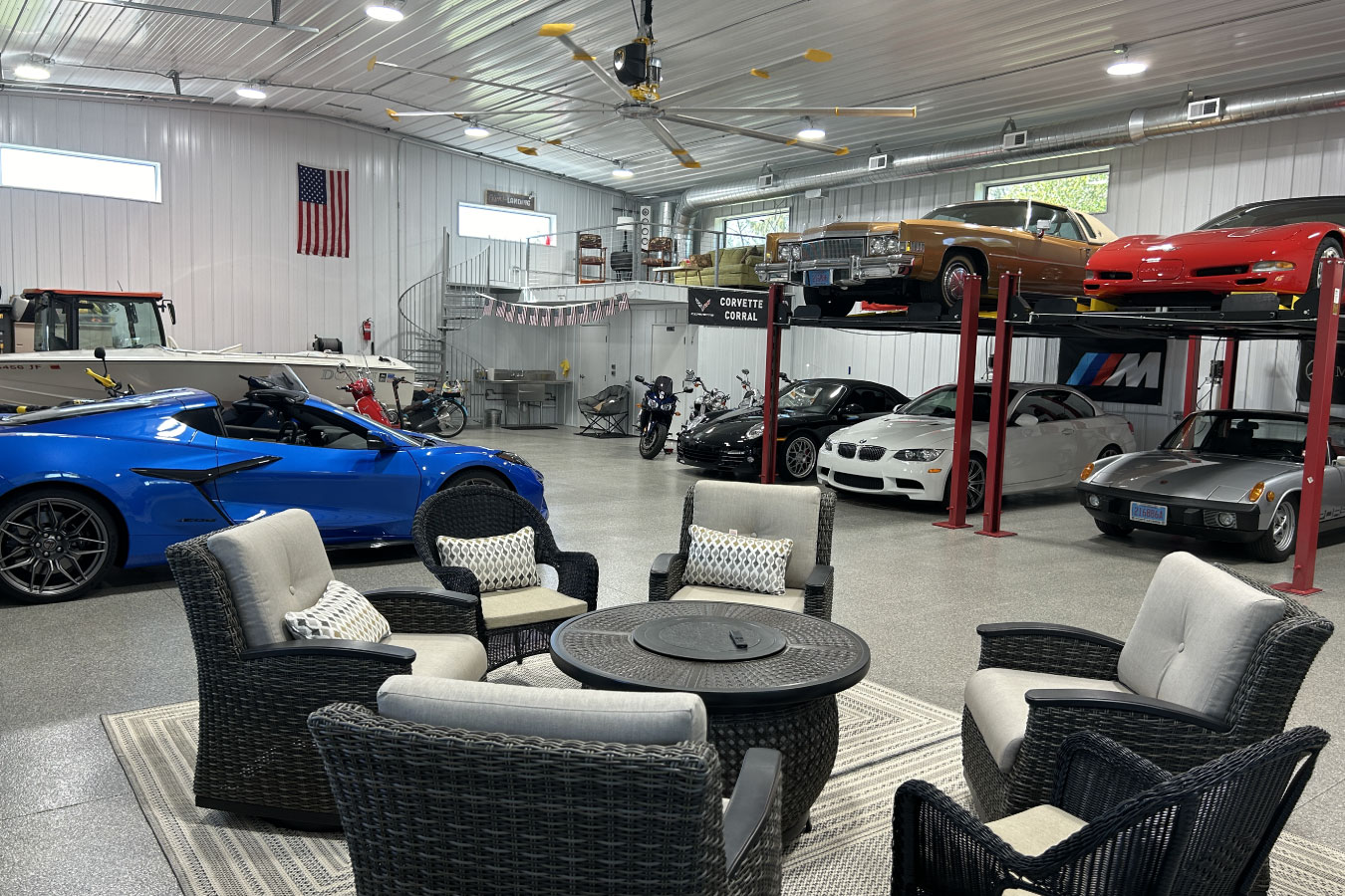 The garage includes a lounge area with comfortable seating, a fire pit, a large TV, and a kitchenette—perfect for entertaining. A full bathroom with a urinal and shower adds convenience, while a loft above, accessed by a custom spiral staircase, provides private guest accommodations. Reinforced scissor trusses support a large industrial fan, with extra bracing for strength and strategically placed lighting to showcase each vehicle. With its high ceilings, wide overhead doors, and a covered side porch, this project is truly a haven for car and motorcycle enthusiasts who value both style and security.